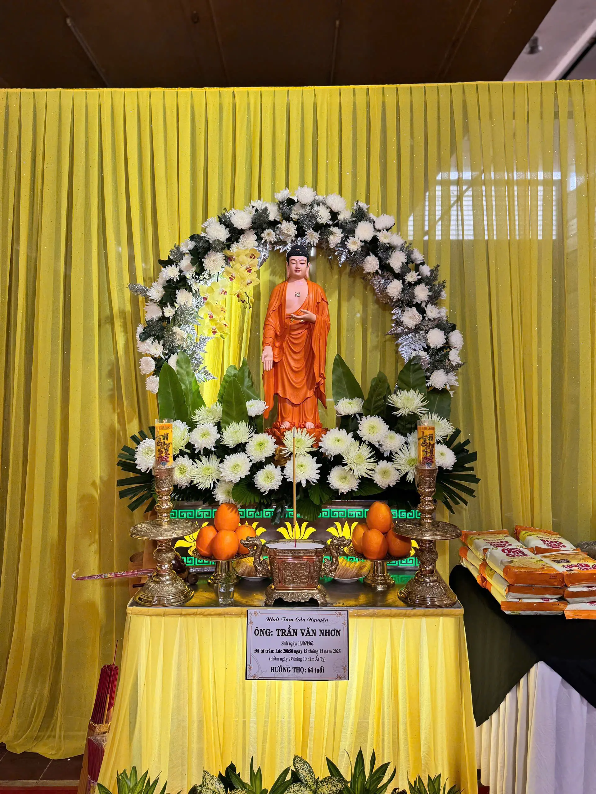 Phật giáo: Tổ chức lễ cầu siêu, thỉnh sư thầy, trang trí linh đường trang nghiêm với màu vàng chủ đạo.